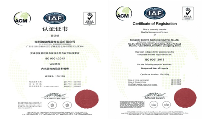由國內(nèi)權(quán)威認證機構(gòu)的嚴格審核,“閨蜜呀”獲得了新版ISO9001:2015質(zhì)量管理體系認證,深圳閨秘雅服飾實業(yè)有限公司在產(chǎn)品的生產(chǎn)過程中嚴格把控產(chǎn)品質(zhì)量,向顧客提供滿意高品質(zhì)產(chǎn)品。閨秘雅公司通過該認證,說明閨秘的生產(chǎn)的內(nèi)衣產(chǎn)品質(zhì)量達到消費者的消費要求,并且受到人們的喜愛,也說明閨秘雅公司的日常管理以及生產(chǎn)工序,操作流程已達到國際生產(chǎn)標準。